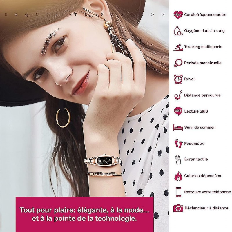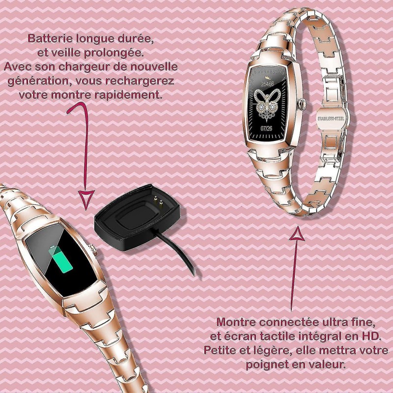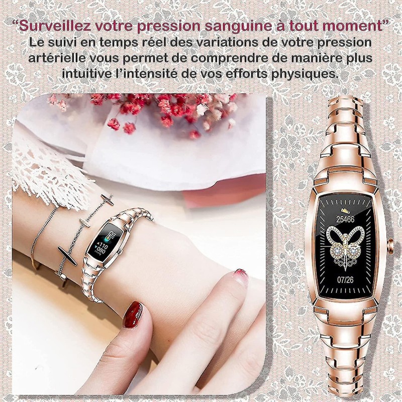 Smart Watch e Health Tracker Questo smartwatch ti consente di registrare con precisione le attività quotidiane, come passi, distanza percorsa, calorie bruciate, frequenza cardiaca, stato del sonno e molto altro. Questo smartwatch supporta diverse modalità sportive. Qualcosa per mantenerti motivato tutto il giorno. Questo smartwatch è un'ottima idea regalo. Notifiche di chiamate e messaggi Questi smartwatch (oro rosa o argento) vibrano quando ricevi chiamate o messaggi in arrivo (Facebook, Twitter, WhatsApp, Line, Skype, Twitter, WeChat, ecc.). Potrai vedere il contenuto del messaggio direttamente sull'orologio. Se sei occupato, puoi riagganciare direttamente. Questi eleganti orologi da donna IP67 ad alta tecnologia hanno le funzionalità più intelligenti sul mercato, come previsioni meteo sincronizzate, promemoria sedentari, una sveglia vibrante, controllo completo di musica e fotocamera e controllo del telefono tramite lo schermo dell'orologio, un cronometro, regolazione della luminosità (solleva il polso per illuminare lo schermo), ricarica rapida magnetica e altro ancora. Più di un semplice orologio da donna Questo smartwatch utilizza un touchscreen IPS HD da 1,09 pollici (2,54 cm) ed è realizzato in acciaio inossidabile per offrirti un'esperienza migliore, il tutto per un look elegante. Anche la pressione sanguigna, i livelli di ossigeno nel sangue e il ciclo mestruale fanno parte delle applicazioni di questo orologio: avrai un monitoraggio completo. Batteria a lunga durata e ampia compatibilità L'orologio Bluetooth da donna è compatibile con Android 4.4 o iOS 8.0 e versioni successive (è richiesto Bluetooth 4.0 o versioni successive), è adatto solo per la connessione a smartphone, non per PC, iPad, tablet. Scansiona il codice QR o scarica/installa l'APP "F Fit" dall'app store del tuo dispositivo mobile. Aprila e attiva il Bluetooth. Fai clic su "Aggiungi dispositivo" e seleziona l'orologio. Divertiti